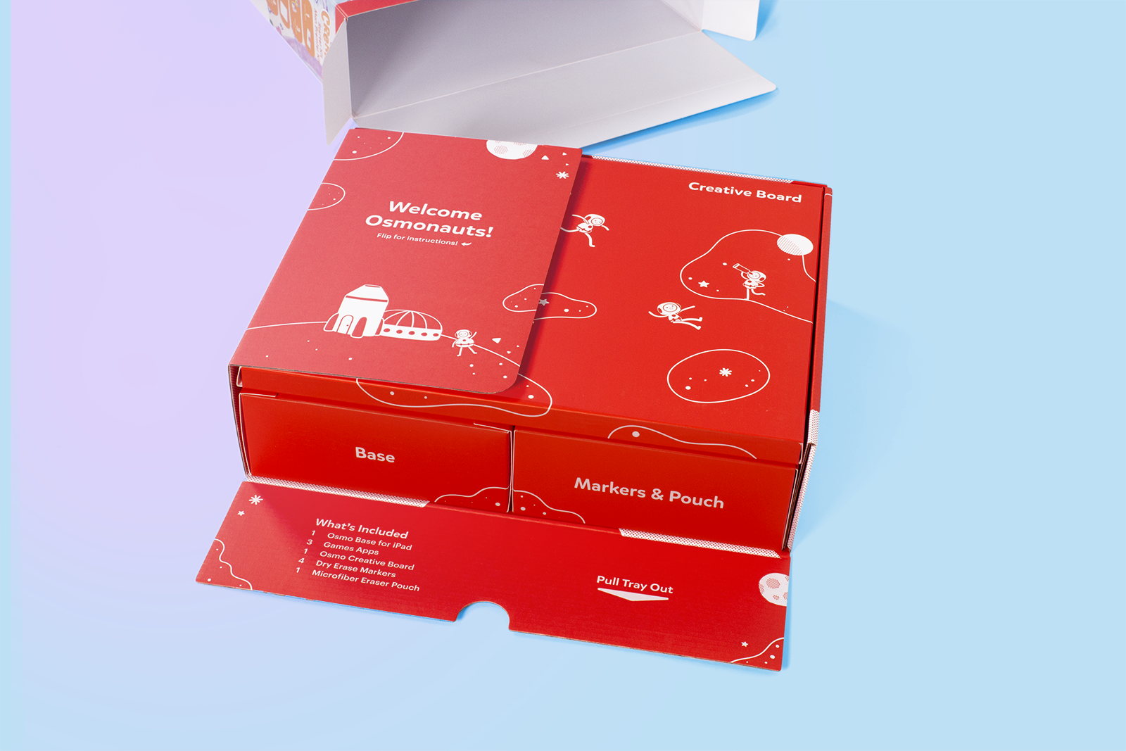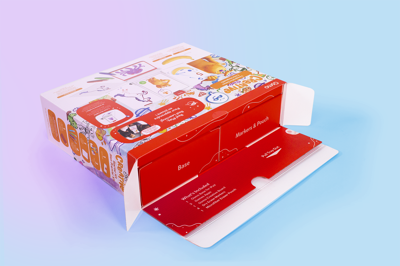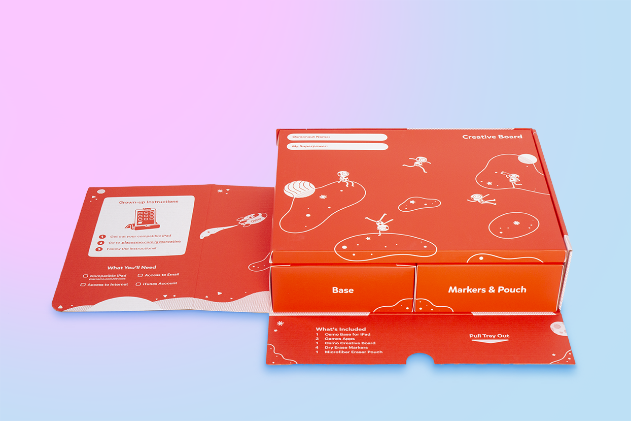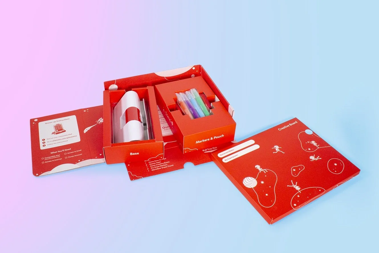 Overview: At Osmo packaging structure development was owned by the hardware team. Our focus with packaging was to provide a delightful unboxing experience that would naturally guide a parent through setting up the device. We also wanted a structure that would feel more like a game or technology product than a toy.